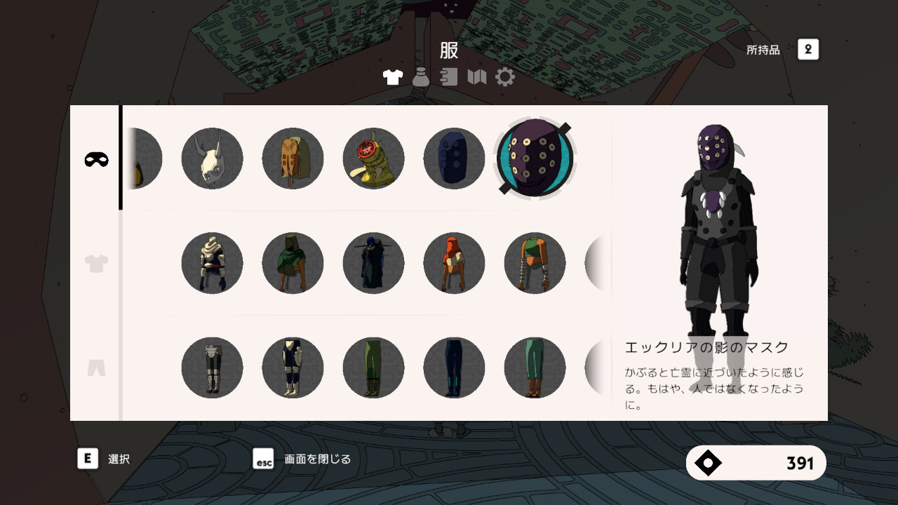 - 最初のエリアから出て、マスクを一つでも収集できれば、メインクエストは完了できる、すなわちゲームクリア可能となる。