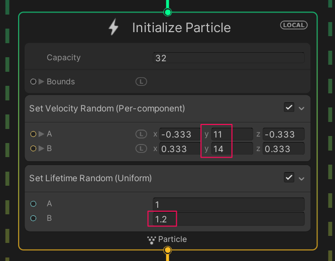 Initialize Particle > Set Velocity Random > A(Min) Yを11、B(Max) Yを14に変更する。パーティクルが上方向に飛び上がるようになる。Set Lifetime Random > B(Max)を1.2に変更する。( 2.2)
