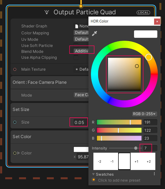 Output Particle QuadコンテキストのBlend ModeをAdditiveに変更する。また、Main TextureをDefault-Particleに変更する。Set Size over LifeとSet Color over Lifeをリムーブする。Set Sizeブロックを追加し、Sizeを0.05に変更する。Set Colorブロックを追加してColorを明るめのイエローに設定し、Intensityを7に変更する。( 2.5)