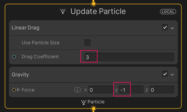 Update ParticleコンテキストにLinear Dragブロックを追加し、Drag Coefficientを3にする。Gravityブロックを追加し、Forceのyを-1に変更する。( 3.4)