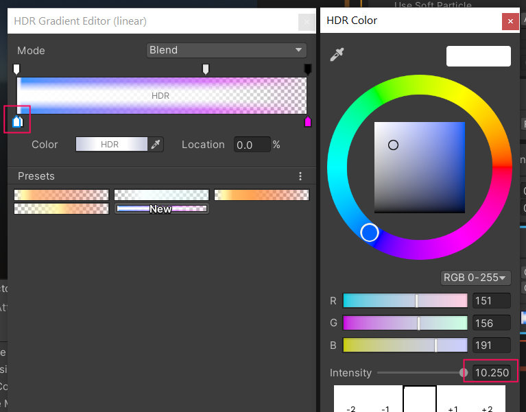 スタートの位置にカラーを追加してIntensityを7.4にすると、花火の爆発時のフラッシュ効果を出すことができる。( 3.6)