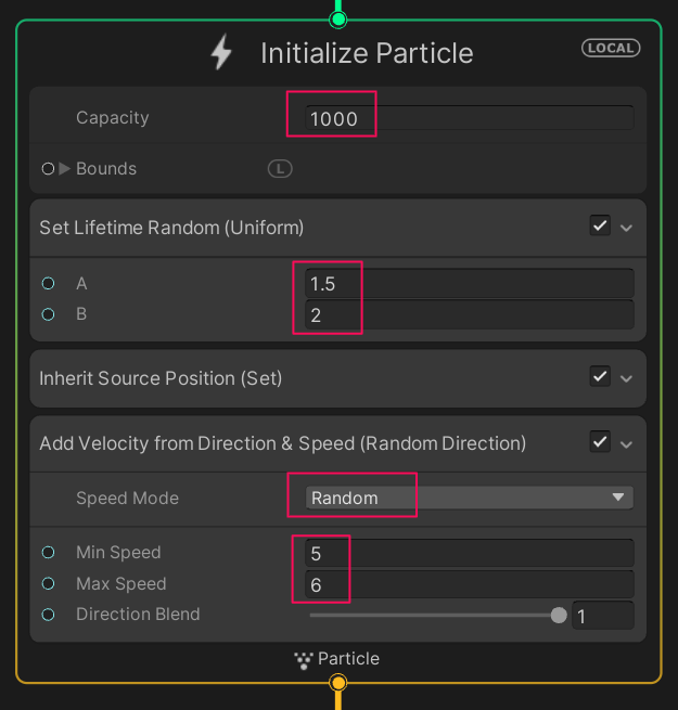 Initialize ParticleコンテキストにSet Lifetime Randomブロックを追加し、A(Min)を1.5、B(Max)を2に変更する。Inherit Source Positionブロックを追加する。Initialize ParticleコンテキストのCapacityを1000に変更する。Add Velocity from Direction & Speed (Random Direction)ブロックを追加する。Speed ModeをRandomに変更し、Min Speedを5、Max Speedを6に変更する。( 3.3)