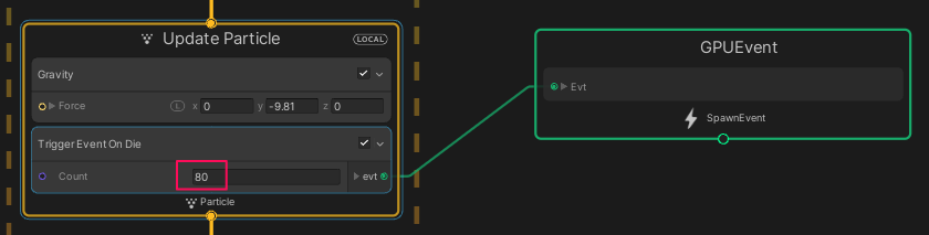 ロケット・パーティクル・システムのUpdate ParticleコンテキストにTrigger Event On Die (GPU Event)ブロックを追加する。Countを80に変更する。extからGPUEventコンテキストを追加する。( 3.1)