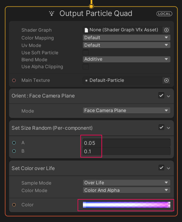 Output Particle QuadコンテキストのSet Sizeブロックを削除し、Set Size Randomを追加する。Aを0.03、Bを0.07に変更する。Set Colorブロックを削除し、Set Color over Lifeブロックを追加し、Colorを設定する。Intensityを5ぐらいに変更する。スタートのカラーを明るめのブルー系、エンドカラーを明るめのパープル系に変更し、スタート位置の透明度をなし(100%)とし、後半の透明度を調整してフェードアウトの度合いを適宜変更する。ブルーカラーのIntensityを5.5、パープルカラーのIntensityを5に変更する。( 3.5)