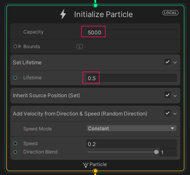 Initialize ParticleコンテキストのCapacityを5000に変更する。Set LifetimeブロックのLifetimeを0.5に変更する。( 5.2)