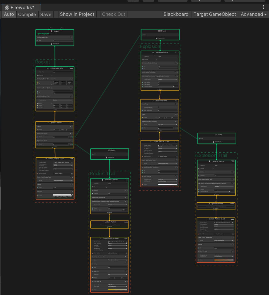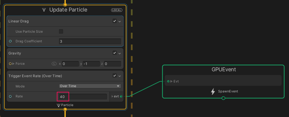 爆発パーティクルシステムのUpdate ParticleコンテキストにTrigger Event Rateブロックを追加し、Rateを40(1秒間に40)に変更する。extからGPUEventコンテキストを追加する。ロケットトレイルパーティクルシステムをコピー&ペーストしてつなげる。( 5.1)