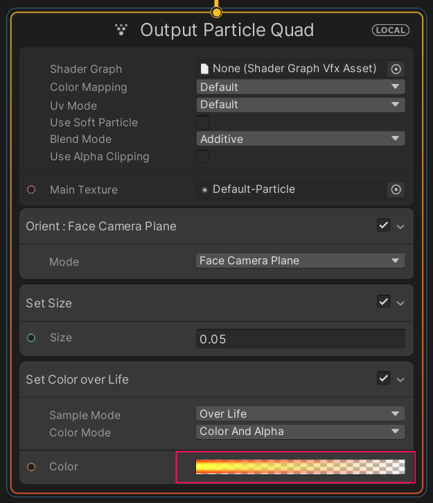 Output Particle QuadコンテキストのSet Scaleブロックを削除する。Set Color over Lifeブロックの最初のカラーをイエローからレッド系に変更する。( 5.3)