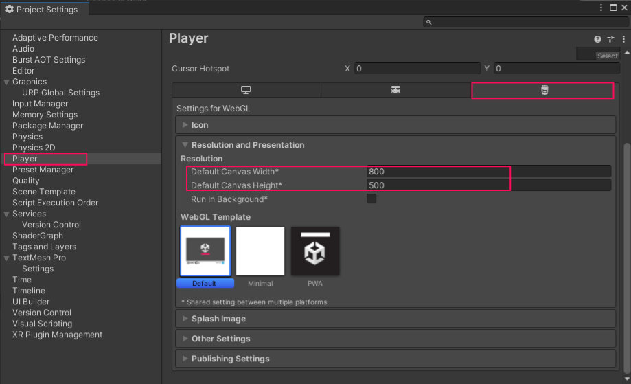 左側メニューより「Player > WebGL Settings > Resolution and Presentation」を選択し、Resolutionの入力欄にWebGLで出力するCanvasの横と縦のサイズを入力します。今回はゲームのアスペクト比に合わせてWidthを「800」、Heightを「500」としました。( 6.3)