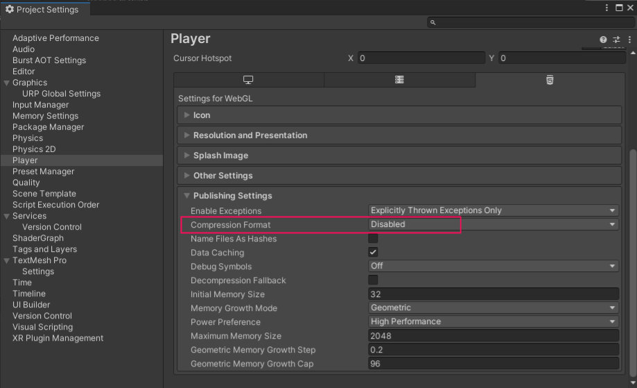 Publishing SettingsのCompression Formatを「Disabled」にします。( 6.4)