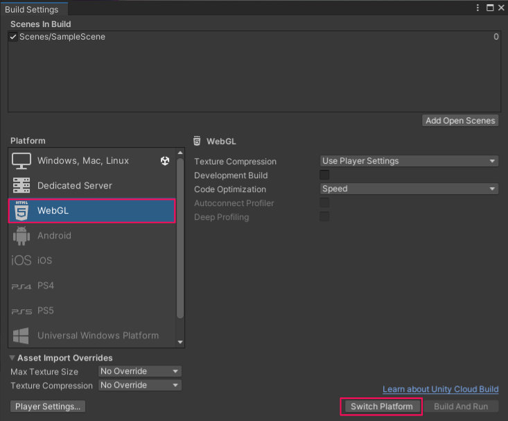 WebGLのモジュールが設定済みであれば、「Switch Platform」ボタンをクリックしてビルドするプラットフォームをWebGLに切り替えます。( 6.1)