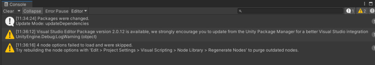 3行目の警告はVisual Scripting関連のメッセージですが、古いノード情報が存在するという警告メッセージのため、後でノード情報の再設定をします。( 2.2)